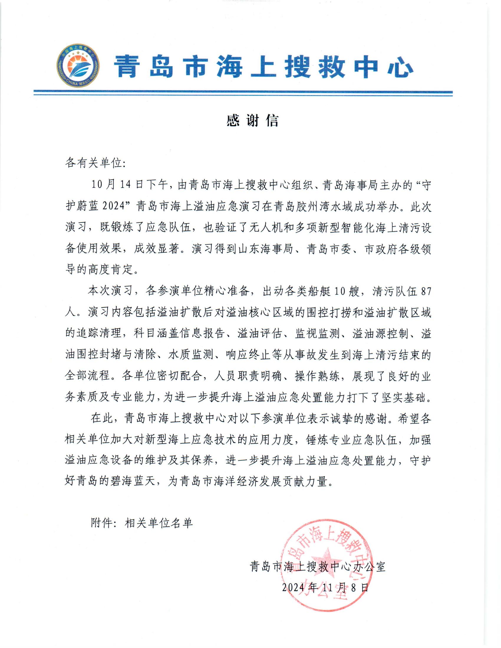 2024 年 10 月 14 日,青岛航顺船务有限公司以卓越的姿态参与了由青岛市海上搜救中心(青岛海事局)精心主办的 “守护蔚蓝 2024” 青岛市海上溢油应急演习。